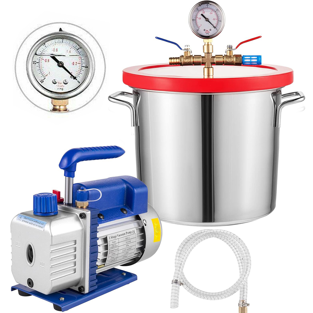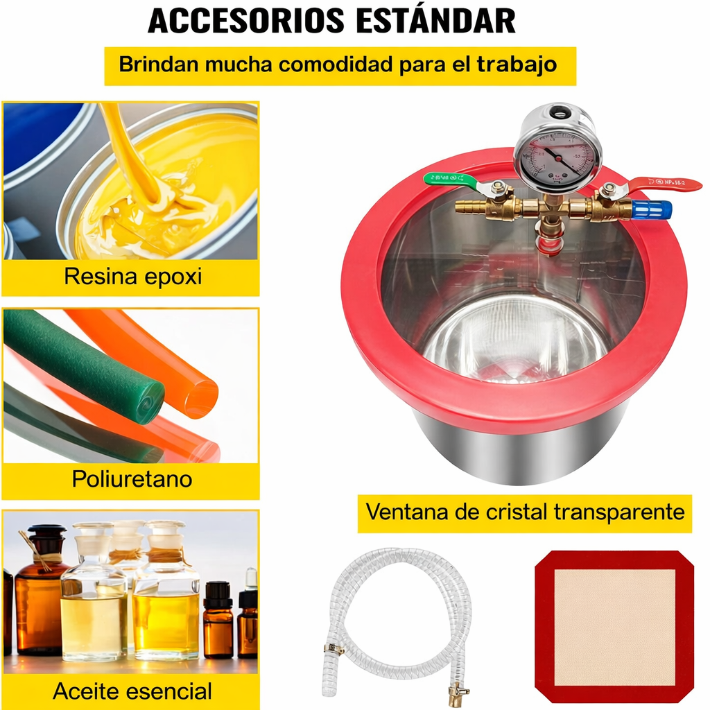 El Kit de Cámara de Vacío es la herramienta ideal para eliminar burbujas de aire en resinas, siliconas y compuestos. Incluye una bomba de vacío de alto rendimiento y una cámara de acero inoxidable con tapa sellada y manómetro de precisión.