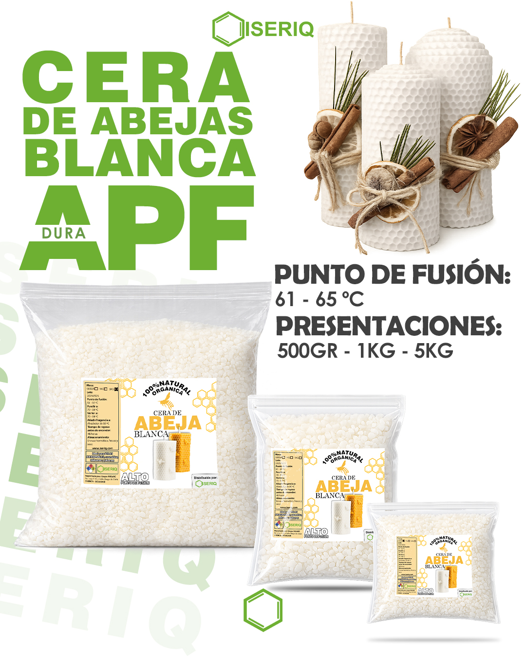 La cera de abeja blanca es un material 100% natural, purificado y refinado para obtener un color claro sin perder sus propiedades originales. Es ampliamente valorada por su alta estabilidad, aroma suave y combustión prolongada. Perfecta para velas decorativas, aromáticas, cosméticas y artesanales que buscan un producto natural, elegante y de alto valor agregado.