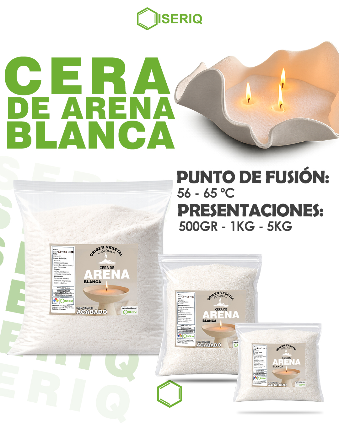 Nuestra cera de arena blanca es una cera de origen vegetal, con apariencia granulada tipo arena fina, ideal para crear velas modernas, minimalistas y personalizadas. Su formato permite rellenar recipientes sin necesidad de molde, logrando diseños limpios, versátiles y reutilizables, con una combustión controlada y uniforme.