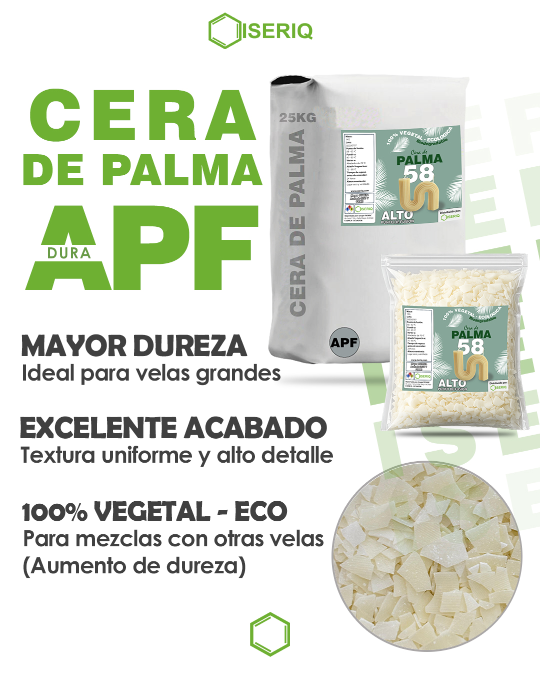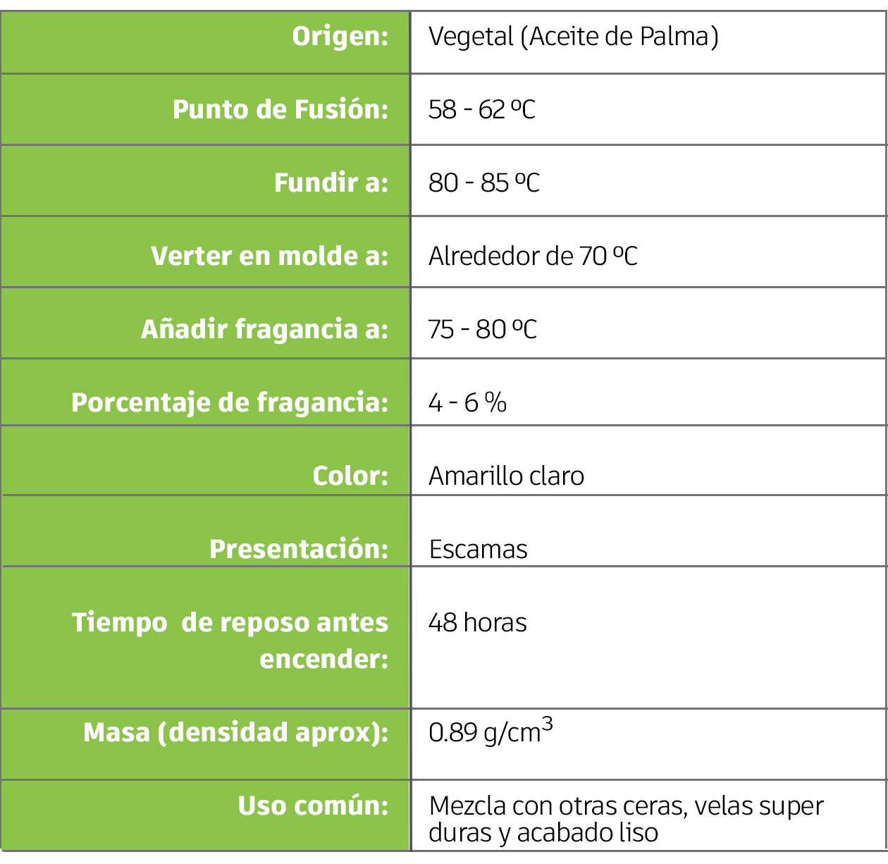 Diseñada para velas tipo pilar o figuras complejas que requieren una alta dureza. Esta cera ofrece un excelente acabado, mayor duración y resistencia al calor. No se recomienda utilizar cera de palma sola, y la proporción de adición no debe superar el 10%.