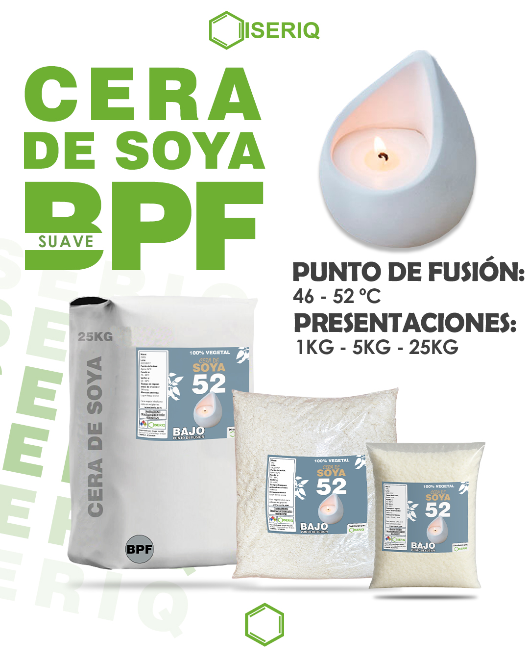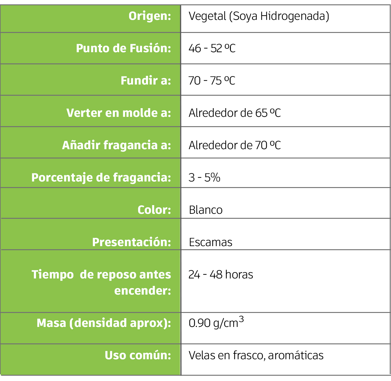 Cera 100% vegetal ideal para velas en envases o recipientes. Su bajo punto de fusión facilita una excelente adhesión al vaso y un quemado uniforme, suave y sin humo. Recomendado para climas templados o fríos.