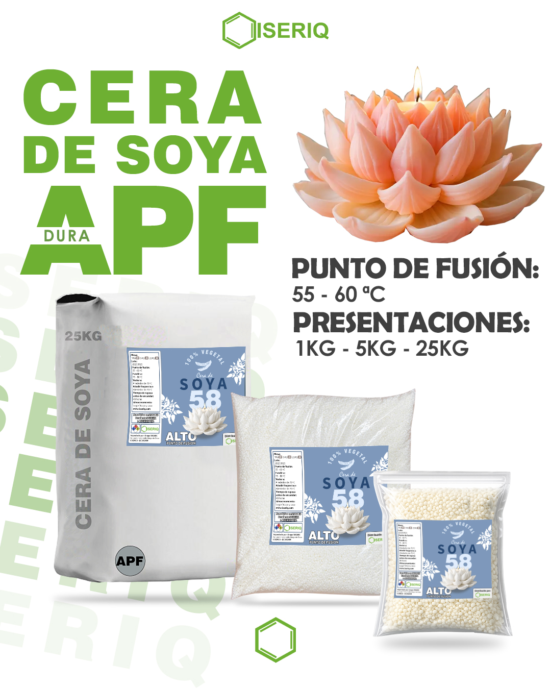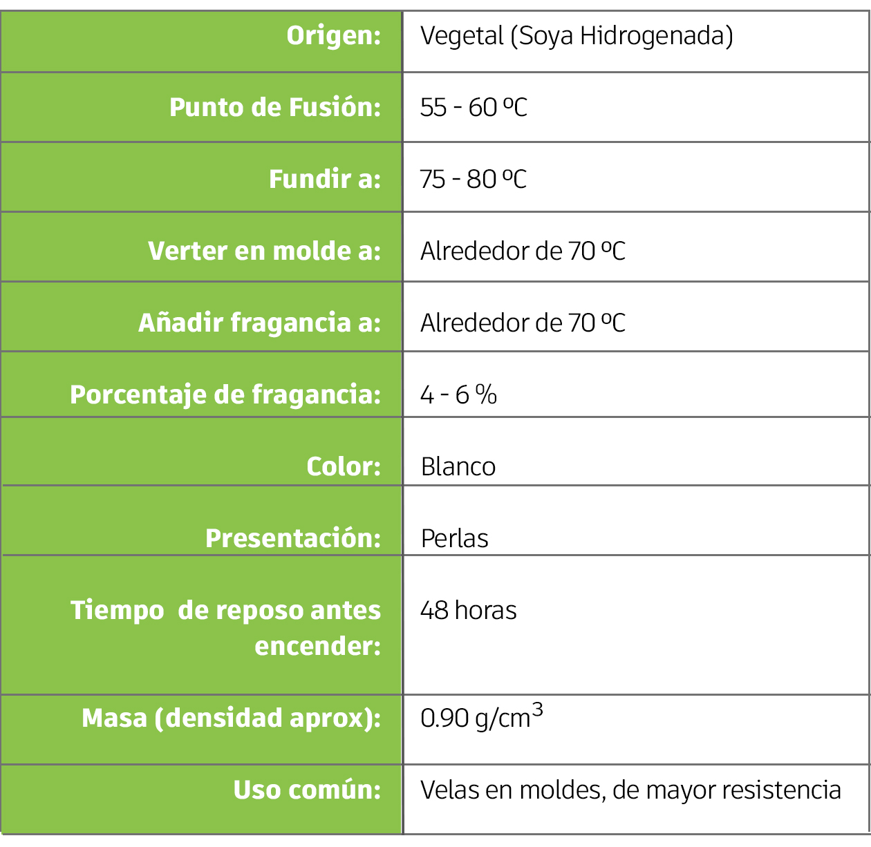 Formulada para brindar mayor resistencia térmica y durabilidad. Esta cera es ideal para climas cálidos, y perfecta para velas en moldes. Mayor dureza y acabado profesional. Perfecta para mezclas personalizadas con otras ceras vegetales.