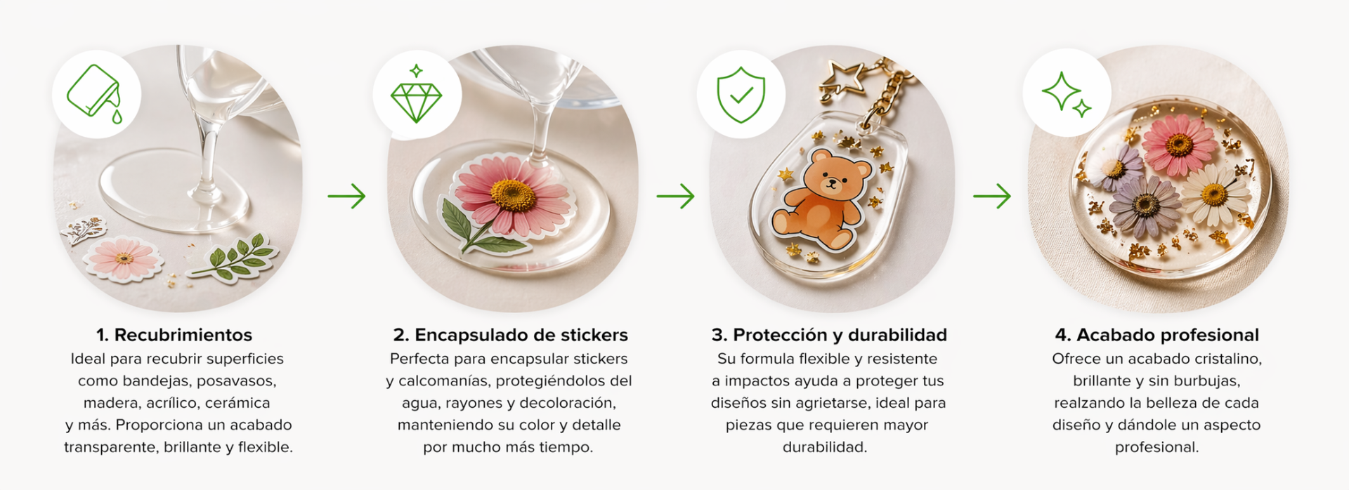 Es de baja viscosidad y cuenta con un excelente sistema antiespumante, es decir, no genera burbujas. Sus cualidades permiten tener un trabajo final con excelente transparencia, asemejándose a un cristal flexible.