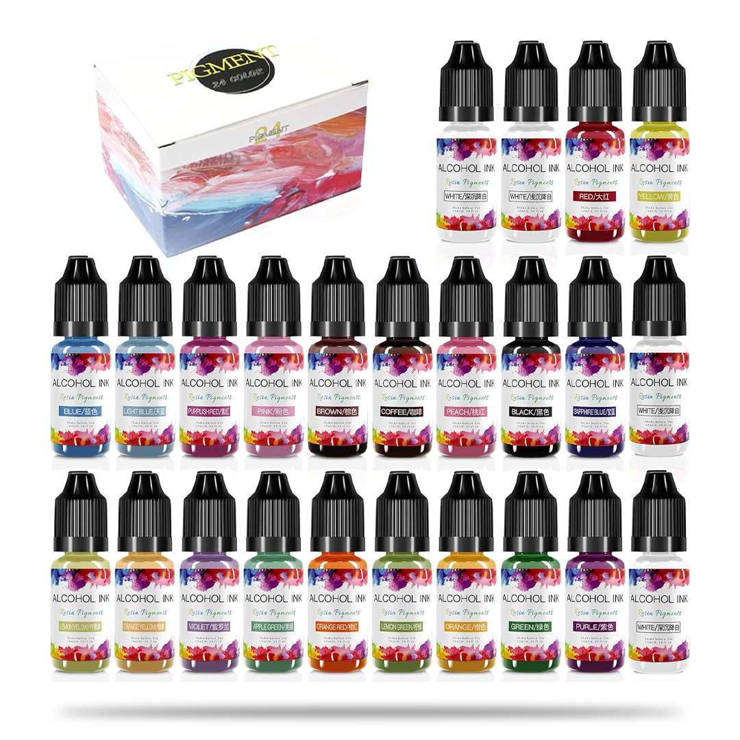 Elevate your creative projects with the ISERIQ Alcohol Ink 24-Pack, a complete collection of high-intensity dyes designed for artists, crafters, and entrepreneurs working with epoxy resin, UV resin, handmade candles, and more. Colors included: